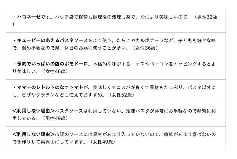 市販のパスタソースの利用状況や意向、重視点などについて聞いています。調査結果をお知らせいたします。