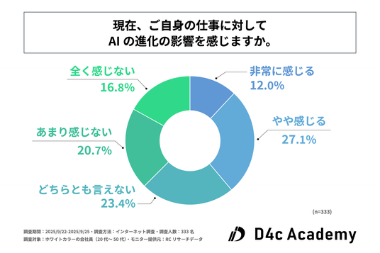 AIの急速な進化は、ビジネスパーソンのキャリアに大きな影響を与え、「自身のスキルが時代遅れになるのではないか」という不安が広がっています。 個人の市場価値を維持・向上させるための学び直しが不可欠となる一方、その必要性に気づきながらも、実際には対応が追いついていない人がほとんどであると思われます。そこで、「AI CONNECT」を運営する株式会社D4cアカデミーは、ホワイトカラーの会社員を対象に「AI時代における会社員のキャリアに対する不安に関する調査」を実施しました。
