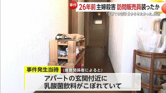 捜査関係者によると、事件発生当時、アパートの玄関付近に乳酸菌飲料がこぼれていて、その量が室内にあった飲料パックから減っていた分とほぼ一致したという。