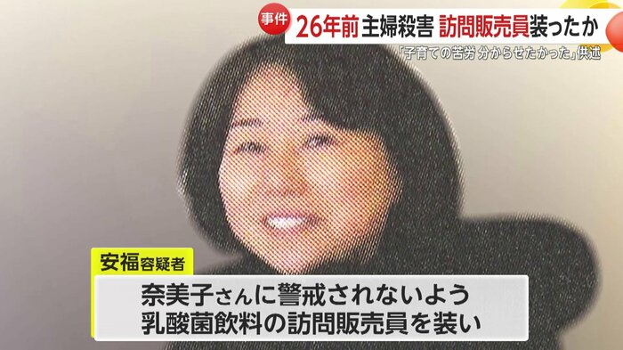 また奈美子さんと当時、面識がなかったとみられる安福容疑者は、奈美子さんに警戒されないよう、乳酸菌飲料の訪問販売員を装い、現場アパートを訪れたとみられることも新たに分かった。