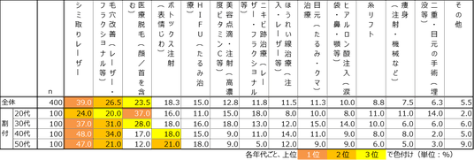 - 年末に受けたい施術1位は「シミ取り(レーザー)」で4割、2位「毛穴改善」、3位「医療脱毛」。
