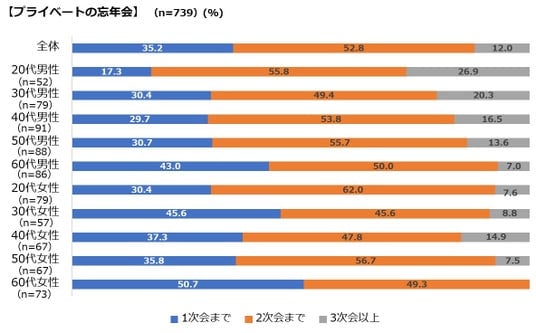 今年の忘年会は、職場・プライベートともに半数以上の参加意向がありました。 忘年会で、何次会まで参加するか尋ねると、職場は「1次会まで」が60%なのに対し、プライベートでは35%にとどまり、職場はスマートにサッと、プライベートは2次会、3次会と長い夜を楽しむという、シーンに合わせたメリハリのある楽しみ方をされる方が多い様子がうかがえました。