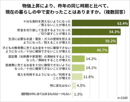 “物価上昇により、昨年の同じ時期と比べて、現在の暮らしの中で変わったこと”について回答を得たところ、