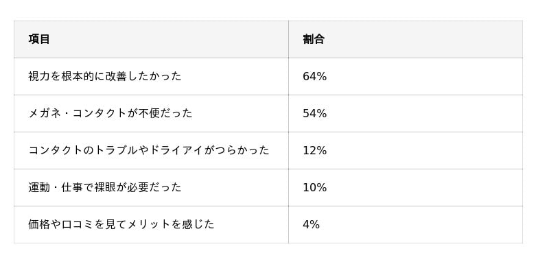 - 施術を受けた理由は「視力を根本的に改善したかった」64%が最多で、次いで「メガネ・コンタクトが不便だった」54%が多かった。