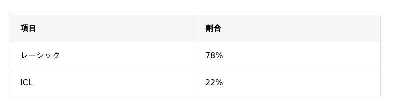 - レーシック経験者はICLより約3.5倍多い(レーシック:78%、ICL:22%)