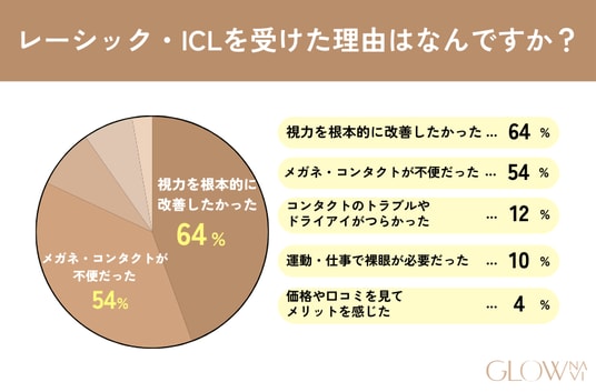 レーシック・ICLを受けた理由で最も多かったのは「視力を根本的に改善したい」というもので、全体の64%を占めました。