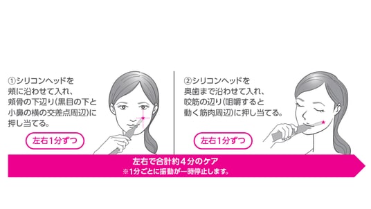 ・お好みの振動強度に調整し、左右4つの美圧ポイントに1分間ずつ押しあててください。1分ごとに振動が一時停止して、美圧ポイントの切り替えタイミングを教えてくれます。