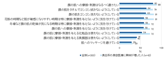 3.80%の人が「顔の肌への摩擦や刺激はなるべく避けたい」と回答。特に、美白系の美容医療に興味が増した人で、この傾向が顕著に。背景に、摩擦や刺激がシミ・肝斑の増加や肌の衰え・たるみなどにつながる懸念が挙がる。