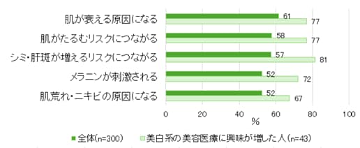 さらに、美白系の美容医療に興味が増した人(※3)に限ると、「摩擦・刺激はなるべく避けたい」と回答した割合は88%に増加し、「冬場など顔の肌の乾燥が気になる時期は特に摩擦・刺激を与えないように気を付けている」と回答した人も72%に達しました。また、顔の肌への摩擦や刺激の影響としては、「シミ・肝斑が増えるリスクにつながる(81%)」や「肌が衰える原因になる(77%)」、「肌がたるむリスクにつながる(77%)」が上位に挙がり、摩擦や刺激によって引き起こされるリスクに対する意識も全体よりも高いことがわかりました。