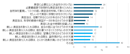 美容や肌ケアに関する考えとしては、「美容に必要以上にお金をかけたくない(26%)」や「必要最低限で効率的な美容法を取り入れたい(24%)」など、効率を重視する回答が上位に挙がりました。さらに、18%の人が「自然体を重視し、リスクの低い美容法を吟味して取り入れたい」と回答しています。