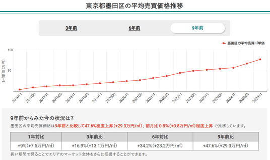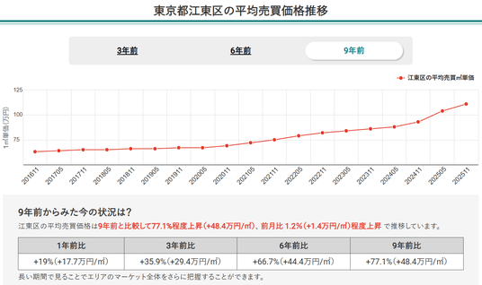 2.2025年11月時点での東京都全体のマンション価格は9年前と比較して68.9%上昇し、堅調な右肩上がりが継続