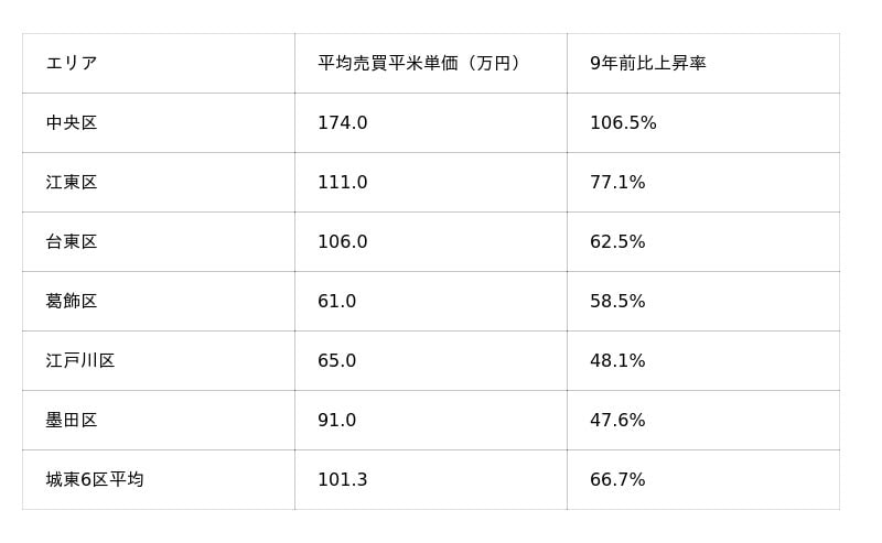 9年前と比較した平均売買価格は、中央区106.5%、江東区77.1%、台東区62.5% の上昇率を記録しており、城東エリア全体の価格押し上げに大きく寄与しています。都心アクセス性の高さや再開発による評価向上が要因となり、これら3区がエリア全体の平均単価を押し上げる大きな役割を果たしています。