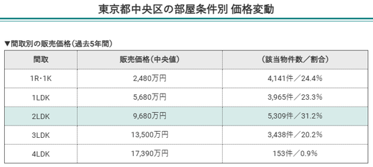 東京都中央区の部屋条件別価格変動(間取別の販売価格)