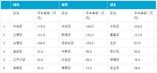 ただし、エリア内では区ごとに価格傾向が大きく異なり、都心直結の中央区の平米単価は174万円、湾岸開発の進む江東区の平米単価は111万円、上野・浅草を抱える台東区の平米単価は106万円と高い水準を形成しています。