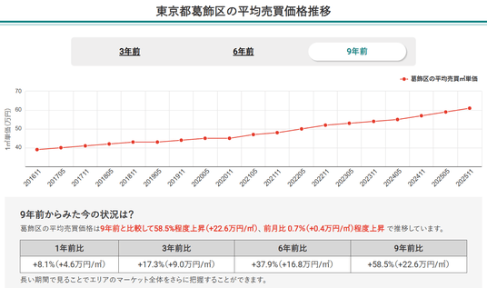 1.マンションナビのデータをもとに、9年前(2016年)の価格推移と比較