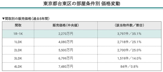 東京都台東区の部屋条件別価格変動(間取別の販売価格)