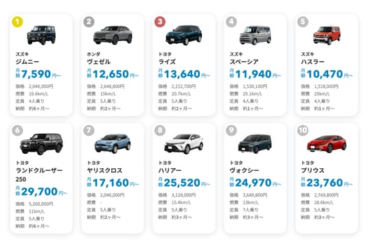 ランキングは、マイカー定額プランに寄せられた実際の申込データをもとに集計。今月も、日常の移動手段として使いやすい軽自動車やコンパクトSUVが上位を占め、ユーザーの関心が集まっています。