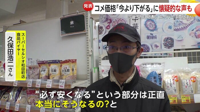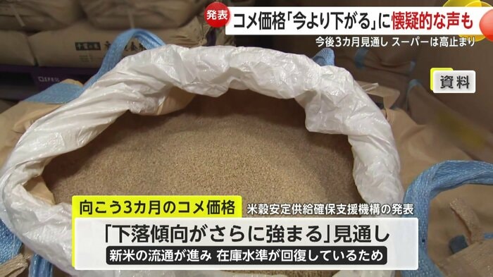 こうしたなか、コメの取引業者などで作る団体(米穀安定供給確保支援機構)は4日、向こう3カ月のコメ価格について「下落傾向がさらに強まる」見通しだと発表した。