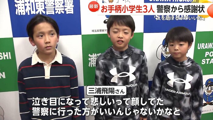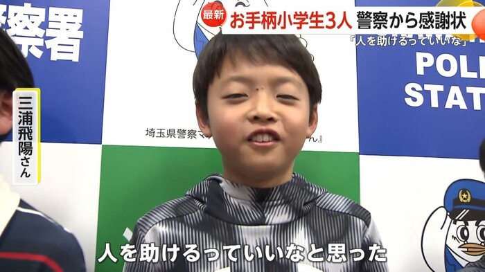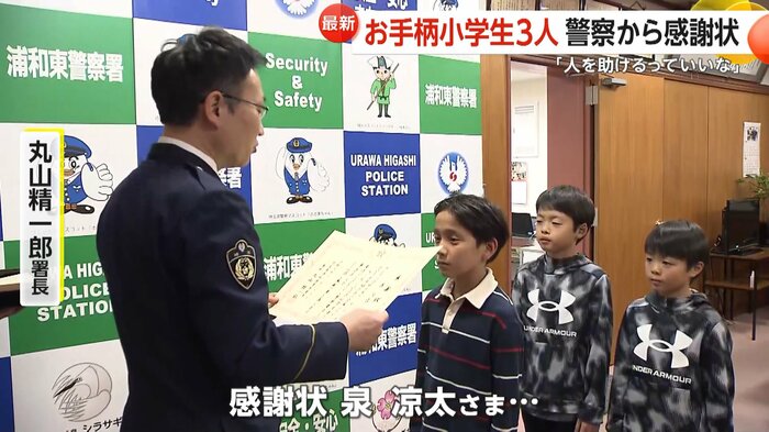 埼玉県警浦和東署の署長から感謝状を受け取ったのは、小学4年の泉凉太さんと三浦飛陽さん、そして飛陽さんの弟で小学2年の琥羽輝さんだ。