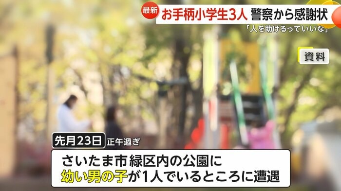 埼玉・浦和東署で4日、公園で迷子になっていた5歳の男の子を保護し、警察署に送り届けた小学生3人に感謝状が贈られた。3人は公園で「迷子になっちゃった」と困っていた男の子に気づき、「警察に行った方がいい」と声をかけて連れてきたという。