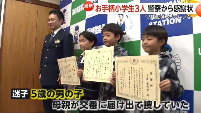 公園で迷子になっていた男の子を保護し、警察署に送り届けた小学生3人に4日、感謝状が贈られた。