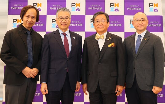 (左から)本事業に関わるPMI日本支部の藤井新吾副会長、端山毅会長と本学の那須保友学長、佐藤法仁副理事・副学長・上級URA