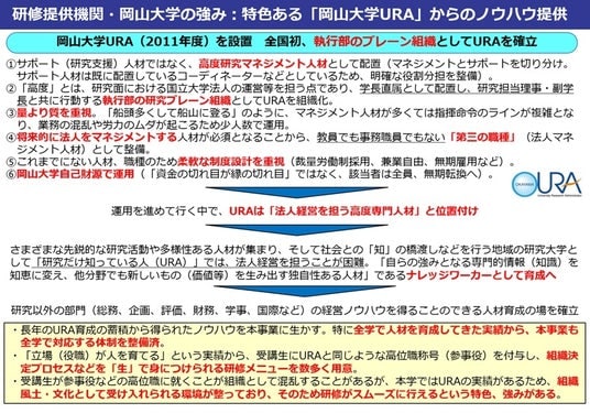 ~「知」から新たな価値を生み出すことのできる研究開発マネジメント人材の育成:岡山大学URAモデルなど特色ある取り組みを生かした研修を提供~