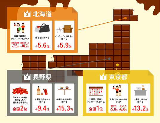 第2位の長野県では、「両親や親族にチョコレートをシェア(両親に渡す+7.5%、両親にもらう+10.7%)」したり、「帰宅後(+5.6%)」や「くつろいでいるとき(+5.9%)」に食べるといった回答が全国平均と比較し多く見られました。