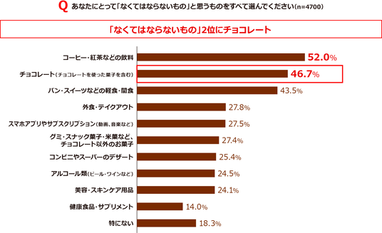 調査では、嗜好品のうち、「あなたにとってなくてはならないもの」を選択する質問に対し、「コーヒー・紅茶(52.0%)」に続く第2位に「チョコレート(46.7%)」が選ばれました。チョコレートが日常生活の中にしっかりと根付いた存在であることがうかがえます。