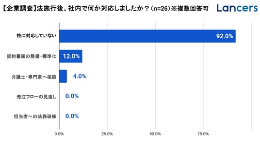 施行後の変化について、フリーランスの約8割が「取引先とのやり取りに変化なし」と回答。一方、企業側も9割以上が「特に対応していない」と回答し、契約書面の整備を行った企業は12.0%にとどまった。制度として定められた取引適正化の取り組みが、現場レベルではほとんど実施されていない実態が明らかになった。