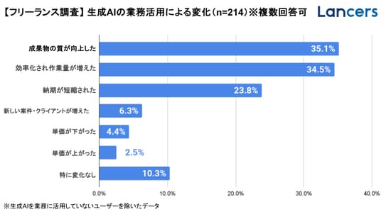 約7割のフリーランスが業務に生成AIを活用しており、「成果物の質が向上した」「効率化され作業量が増えた」「納期が短縮された」といったメリットを感じる声が寄せられた。現場では、制度対応よりも生成AIの活用が先行していることがうかがえる。