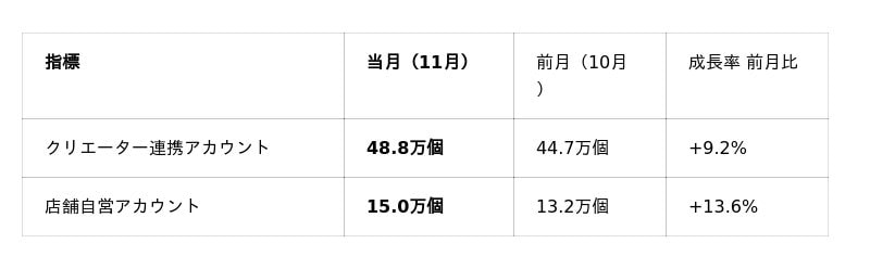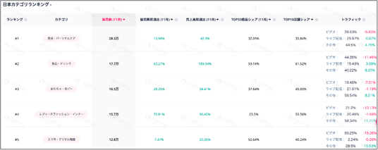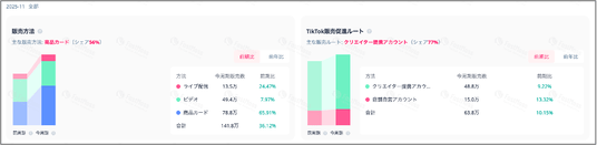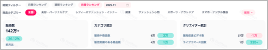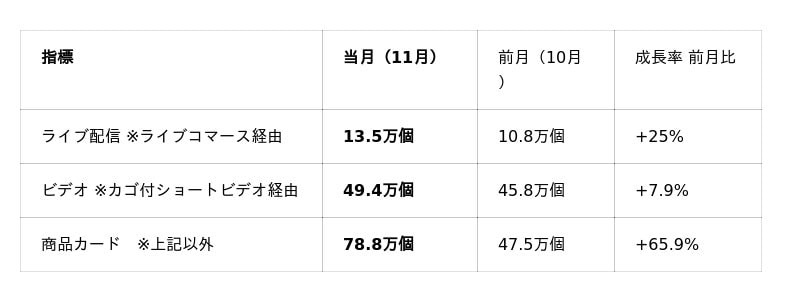 ライブ配信とカゴ付きショートビデオの2指標で比較した場合、7月~10月に続き、販売の主流は引き続きビデオ経由となっています。一方で、11月の前月比成長率に着目すると、ライブ配信経由の販売は 25%増 と大きく伸長し、ビデオ経由の 7.9%増 を上回りました。このことから、ライブ配信の実施頻度が以前より増加し、その影響が売上成長にも反映され始めていることが示唆されます。