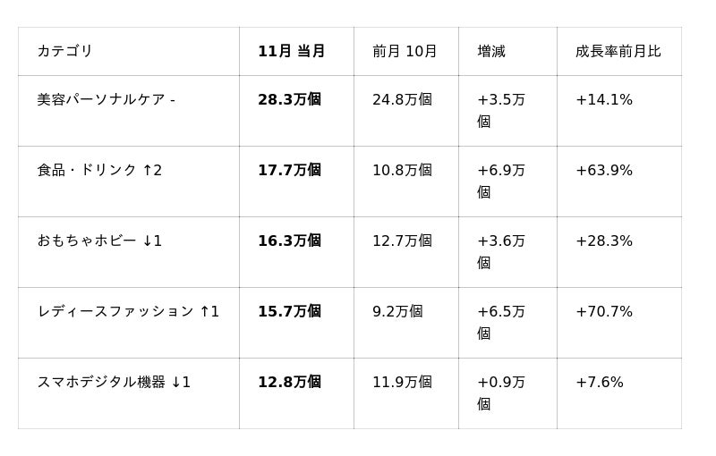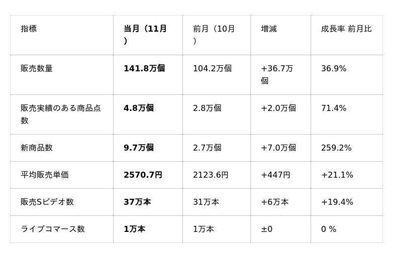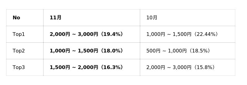 と、いずれの価格帯も大幅に数量が増加しており、11月は中価格帯以上の商品が市場全体の成長を強力に牽引したことが分かります。