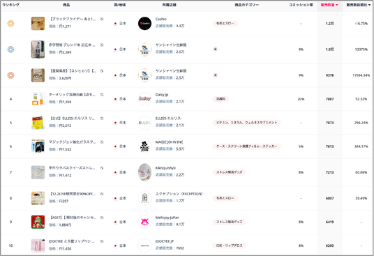 10月に続き、11月の1位は「ふわふわブランケット(店舗:Cashio)」で、推計販売数は約1.2万個でした。2位・3位には食品カテゴリから「お米(店舗:サンシャイン生鮮館)」がランクインし、店舗ライブでは同時接続数が1万人近くに達するなど、大規模なライブ配信が販売拡大に大きく寄与しています。さらに、4位には「ターメリック洗顔石鹸(店舗:Daisy Jp)」、5位には「ビタミンCサプリ(店舗:ELLISS-エルリス-)」が新たに登場しました。売れ筋上位にサプリメントがランクインするのは今回が初めてであり、美容・健康カテゴリの裾野が広がり始めている兆候が見られます。