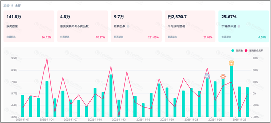 10月は成長率が一時的に鈍化したものの、11月には大幅に回復し、再び強い成長基調へ戻っています。この背景としては、新商品数の急増に加え、ブラックフライデーセールなどの大型販促施策が、成長率を大きく押し上げた要因であると考えられます。また、平均販売単価にも大きな変化が見られました。7月~10月は概ね2,000円前後で推移していたところ、10月の2,123円から11月は2,570円へと447円増加しており、これも11月の重要なトピックの1つとなっています。
