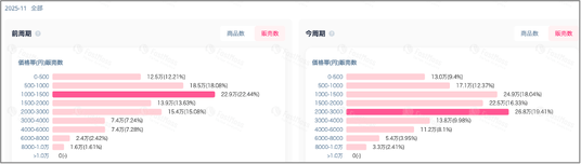 当月(11月)と前月(10月)を販売価格帯別に比較すると、0~1,500円の低~中価格帯は販売数量がわずかに増加したものの、全体として大きな変化は見られません。一方で、1,500円以上の中価格帯~高価格帯の商品が大きく伸長しています。