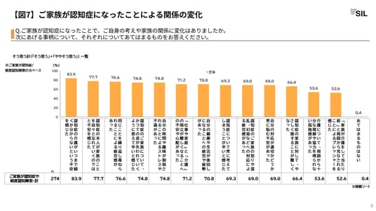 ・ご家族が認知症になったことによる関係の変化を伺うと、「家族のことを段々と忘れていく不安(77.7%)」「同じことを繰り返し尋ねられることによる疲労感(76.6%)」といった不安感や、「介護がいつまで続くか分からない(83.9%)」「自分の時間や趣味が制限される(74.8%)」といった介護がご自身の生活の中心になる負担が7割を超え、ご家族の抱える不安や負担は多岐にわたることが分かりました。