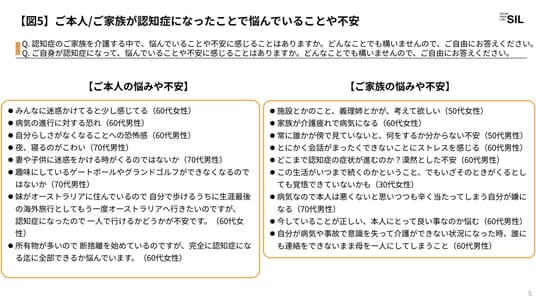 ・ご家族が認知症になったことで感じる悩みや不安は介護に関するものが多くあがり、「どこまで認知症の症状が進むのか?漠然とした不安」「今していることが正しい、本人にとって良い事なのか悩む」など、認知症のご本人と向き合う中での負担や認知症の進行に関する不安、介護の方針について葛藤する声などがみられました【図5】。