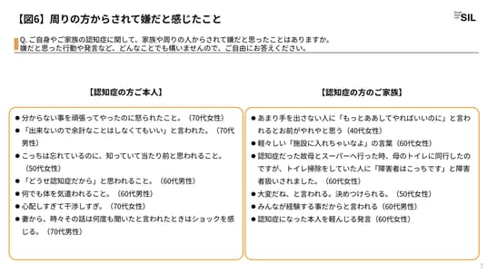 ・ご自身やご家族の認知症に関して周りの方からされて嫌だと感じたことを伺うと、「どうせ認知症だから」などの決めつけの言動や「もっとああしてやればいいのに」といった無責任なアドバイスを受けた経験を持つ人が見られ、社会全体の理解不足が認知症を患う方またそのご家族の孤立や負担を助長していることがうかがえました【図6】。