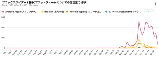 <ダッシュボードから抜粋>ブラックフライデーにおける各ECプラットフォームについての発話量の推移