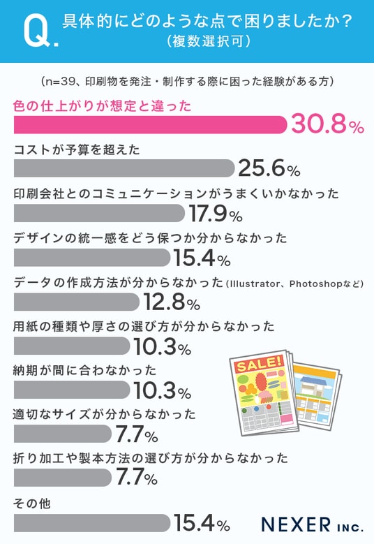 次いで「コストが予算を超えた」、「印刷会社とのコミュニケーションがうまくいかなかった」といった費用面や、やり取りの難しさも課題に挙げられました。