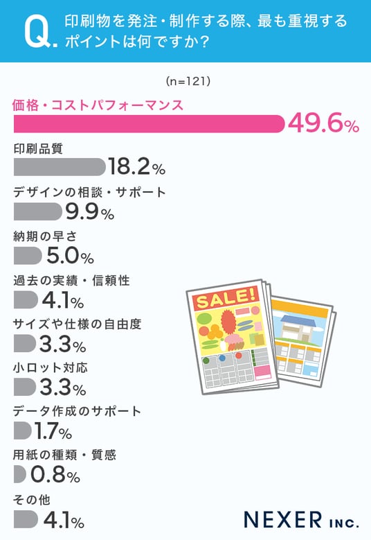 印刷物を発注・制作する際に最も重視されているのは「価格・コストパフォーマンス」で、全体のおよそ半数を占めました。