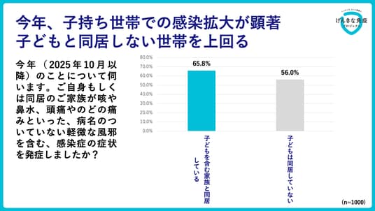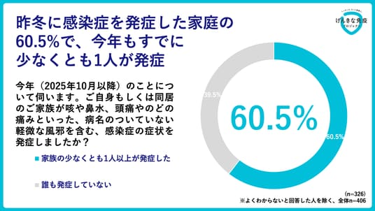 昨冬感染症の症状を発症した家庭の60.5%で、今年(10月以降)すでに家族内の少なくとも1人が感染症の症状を発症している。子持ち世帯(65.8%)が、子どもと同居しない世帯(56.0%)を上回る。