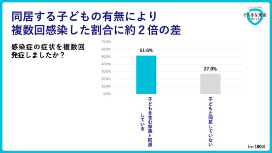 - 子持ち世帯では、同居家族の2人以上が複数回罹患した割合が51.6%と、子どもと同居しない世帯(27.0%)を大きく上回る。
