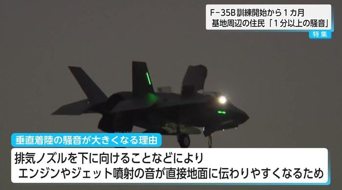 防衛省は、「排気ノズルを下に向ける垂直着陸態勢をとることでエンジンやジェット噴射の音が通常の着陸よりも大きくなる」と説明している。