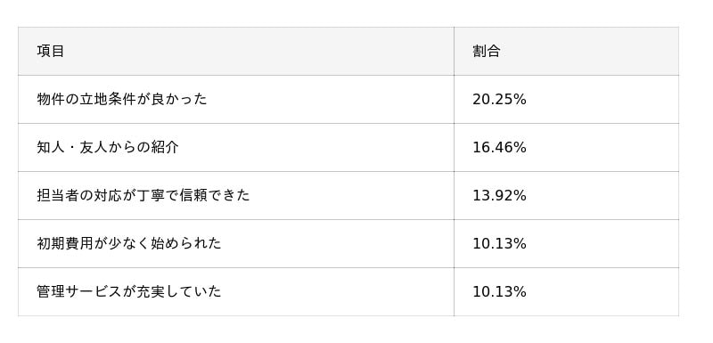 - 不動産会社を選んだ時に重視したポイントについては「物件の立地条件が良かった」(20.25%)がトップだった。