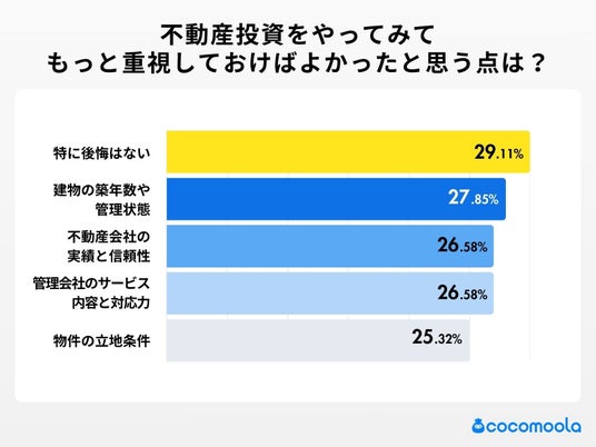 - 一方で、「投資を始める前にもっと重視すればよかった」と思う点では、「特に後悔はない」(29.11%)に次いで、「建物の築年数や管理状態」(27.85%)、「不動産会社の実績と信頼性」(26.58%)が並んだ。調査から、物件の物理的な状態や、長期的なパートナーとなる会社の信頼性を重視すべきという不動産投資サービス選びの注意点が見えてきた。