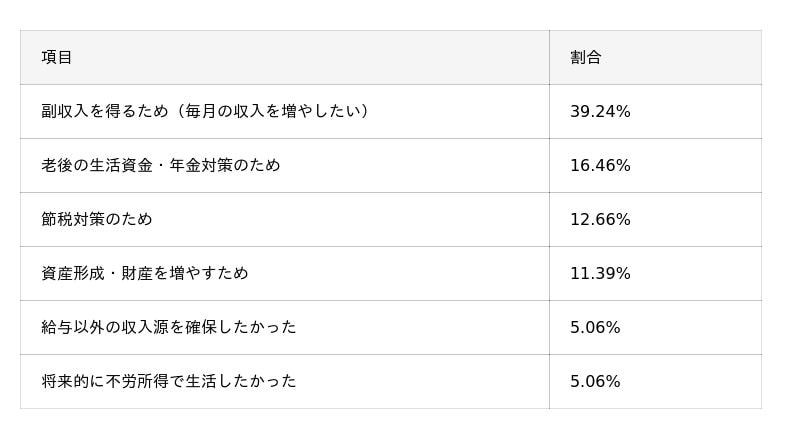 - 不動産投資を始めた目的として最も多かったのは「副収入を得るため(毎月の収入を増やしたい)」(39.24%)で、短期的な収入増加を重視する傾向が見られた。