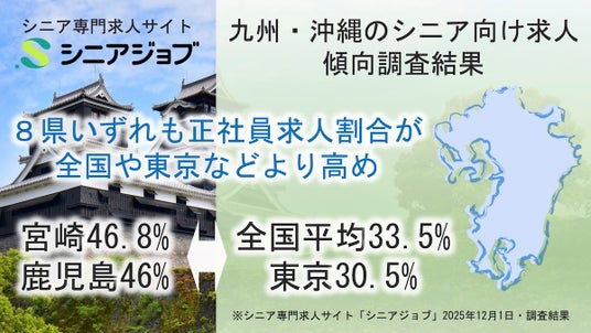 シニア転職支援の株式会社シニアジョブ(本社:東京都新宿区/代表取締役 中島康恵)は、運営するシニア専門求人サイト「シニアジョブ」に掲載された九州・沖縄8県の求人について、その傾向・特徴を調査しました。その結果、正社員求人の割合が全国では33.5%に対し、宮崎では46.5%など九州・沖縄全体が高い傾向にあることがわかりました。