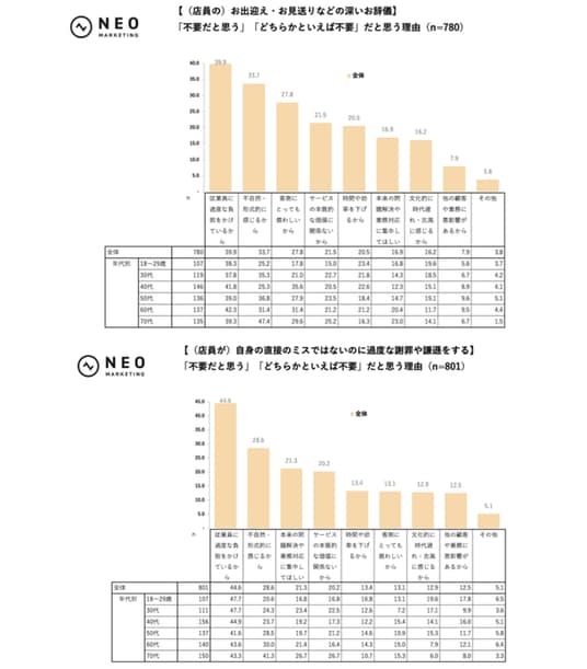 一方で、「過度に丁寧な敬語」「雑談や世間話まで笑顔で応じること」は賛否が分かれ、「深いお辞儀」や「自身の直接のミスではないのに過度な謝罪や謙遜をする」といった儀礼的・自己犠牲的なおもてなしは約70~80%(※2)が「不要」と見なされています。